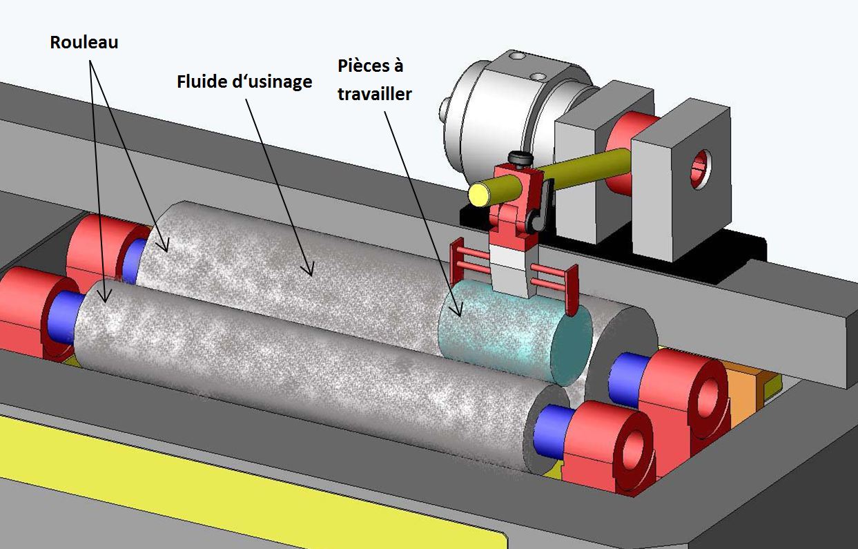 Mais les pièces sont cylindriques et sont usinées avec 2 rouleaux en fonte ou 2 plateaux en fonte. Avec ce processus il est possible d’améliorer nettement la qualité de la surface ainsi que la cylindricité.